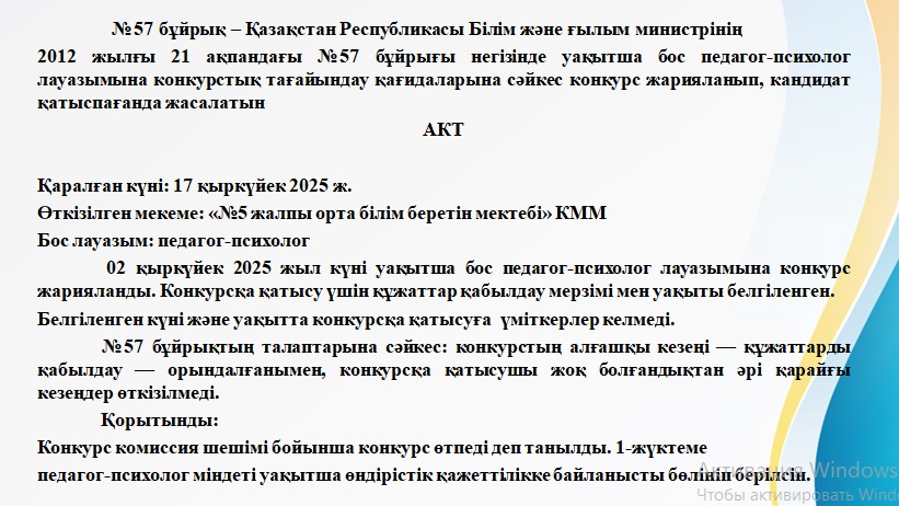 № 57 бұйрық – Қазақстан Республикасы Білім және ғылым министрінің 2012 жылғы 21 ақпандағы № 57 бұйрығы негізінде уақытша бос педагог-психолог лауазымына конкурстық тағайындау қағидаларына сәйкес конкурс жарияланып, кандидат қатыспағанда жасалатын