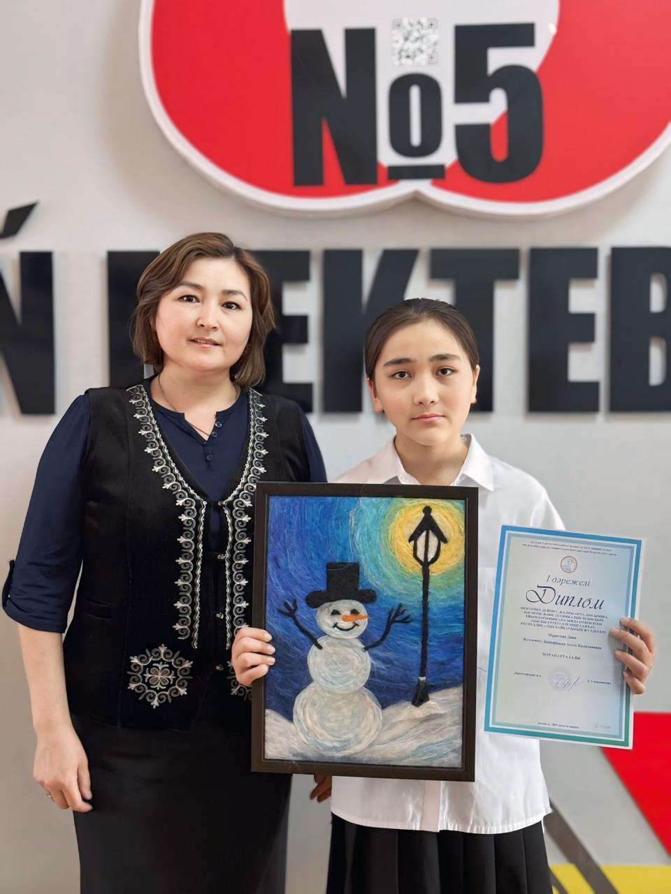 Мектепке дейінгі, жалпы орта, қосымша, кәсіптік және техникалық білім беру ұйымдарының арасында өткізілген "Қысқы ертегі әлеміне саяхат" республикалық байқауына қатысқан 5 "А" сынып оқушысы Мұратқан Дина Медетқызы І - дәрежелі дипломмен марапатталды.Жетекшісі: Конырбаева Асель Калихановна. Құттықтаймыз!